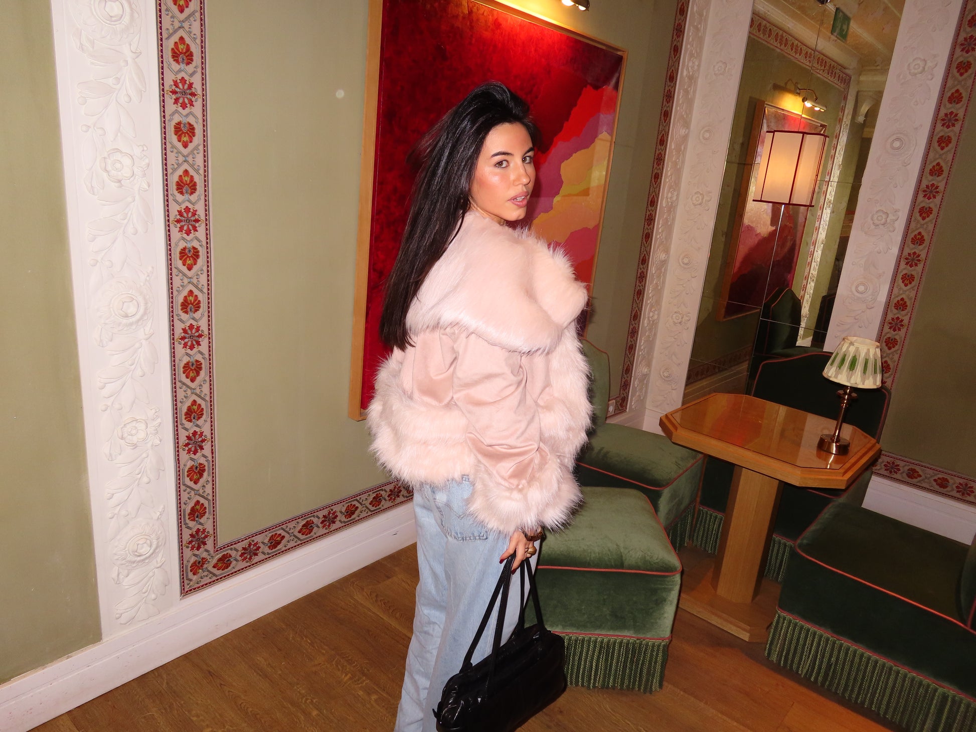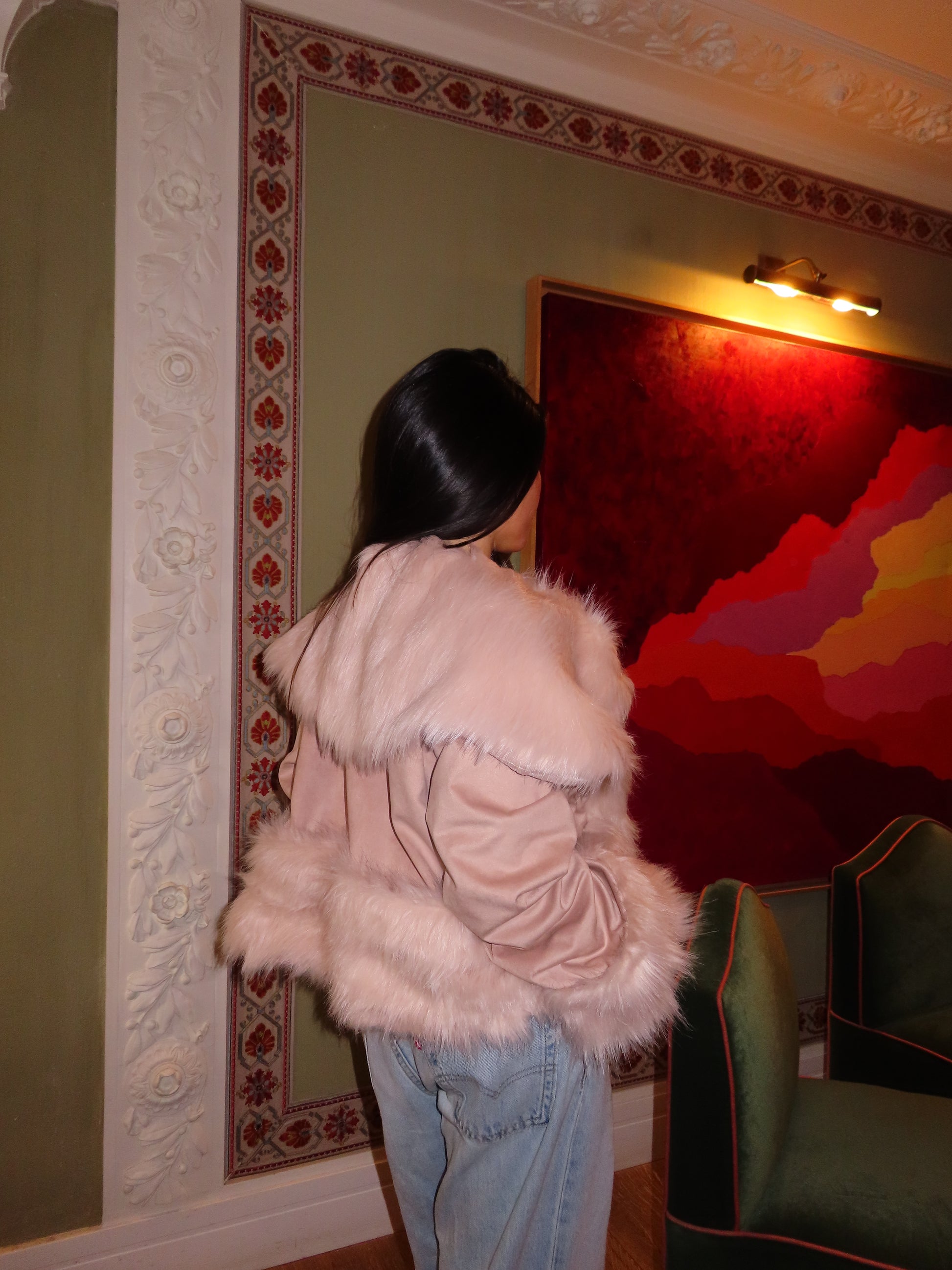 This baby pink jacket is made from soft peach-skin fabric with a suede-effect finish. It feels smooth and luxurious to the touch.