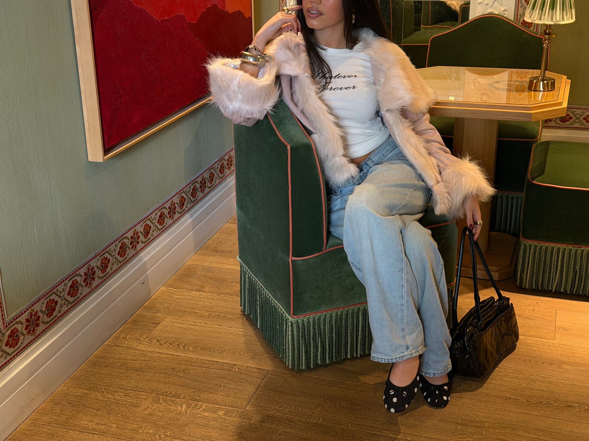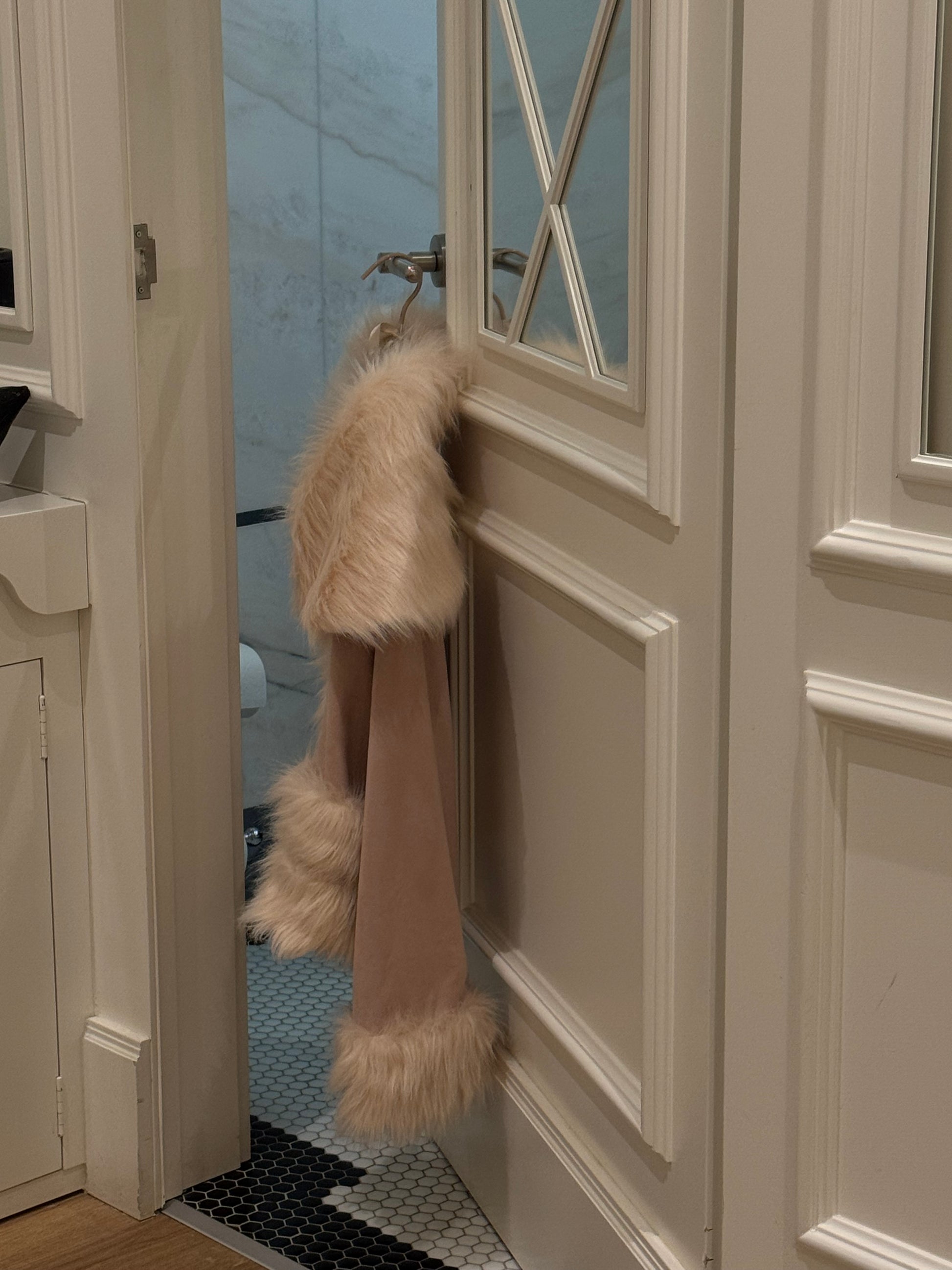 It features faux fur on the collar and sleeves, adding warmth and elegance. The inside is fully lined with satin fabric and a delicate polka dot pattern for extra comfort.